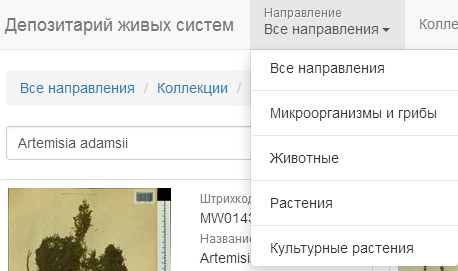 Я понимаю, "направления" - это термин из внутреннего административного жаргона, но на сайт-то его зачем вытаскивать? Можно же более человеческим языком написать. Раз "депозитарий живых систем", то речь должна идти не о "направлении", а, как следует из содержания меню, о группе живых систем. Так вот вместо слова "направление" можно написать "группа (организмов)", а в меню вместо "Все направления"- "Все группы".Захват-1.png |