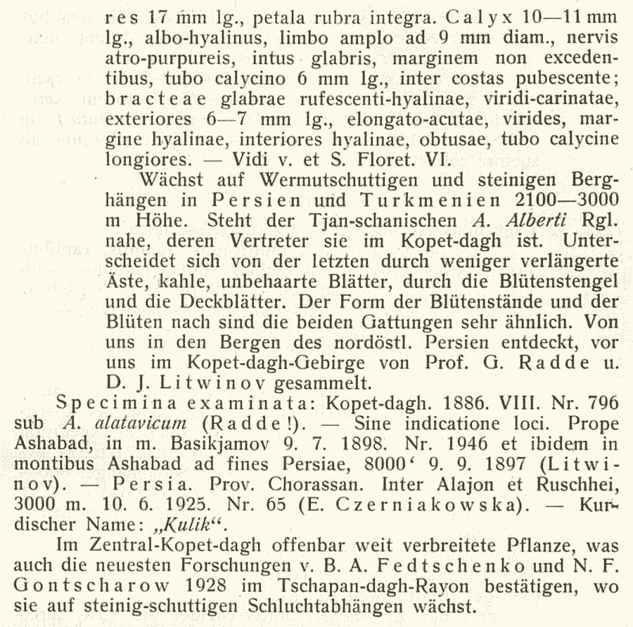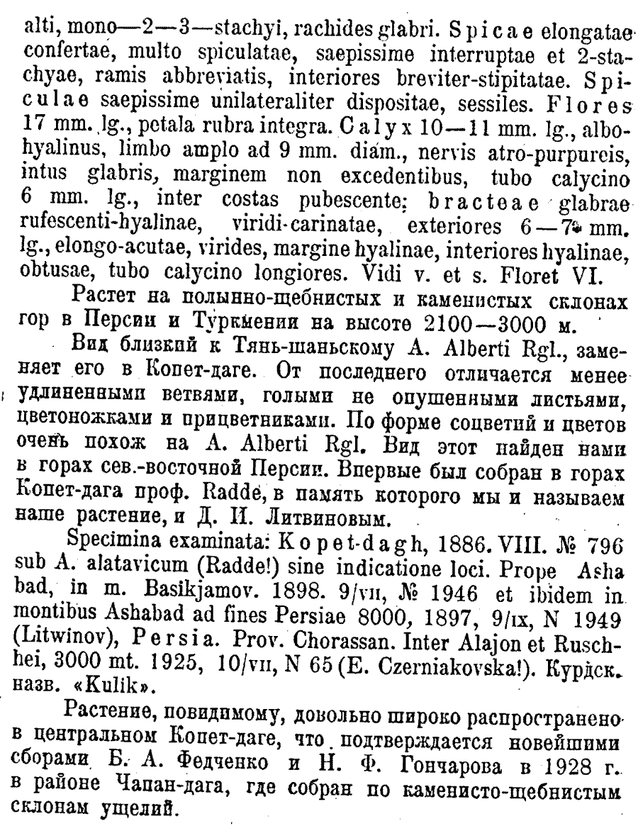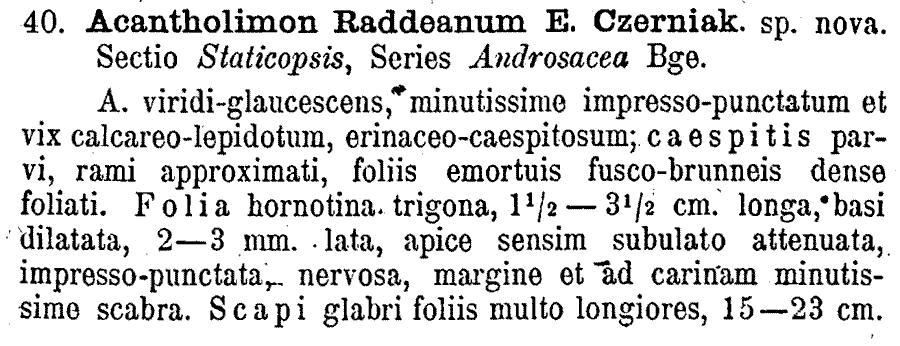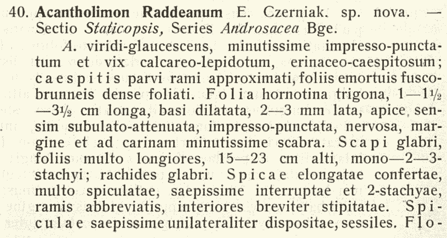| Андрей Ковальчук | Комбинация Acantholimon raddeanum Czerniak. была опубликована в 1930 г. в двух журналах - в "Известиях Главного ботанического сада" и в " Repertorium specierum novarum regni vegetabilis...". Первый вариант (Известия Главного ботанического сада СССР 29(1-2): 149(-150). 1930):