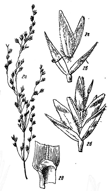 Рисунок Н.З. Семёновой-Тян-Шанской из 1 тома "Флоры Мурманской области" (стр.207): а) метёлка; б) колосок; в) колосковые чешуи; г) цветочные чешуи; д) листовое влагалище с язычком.