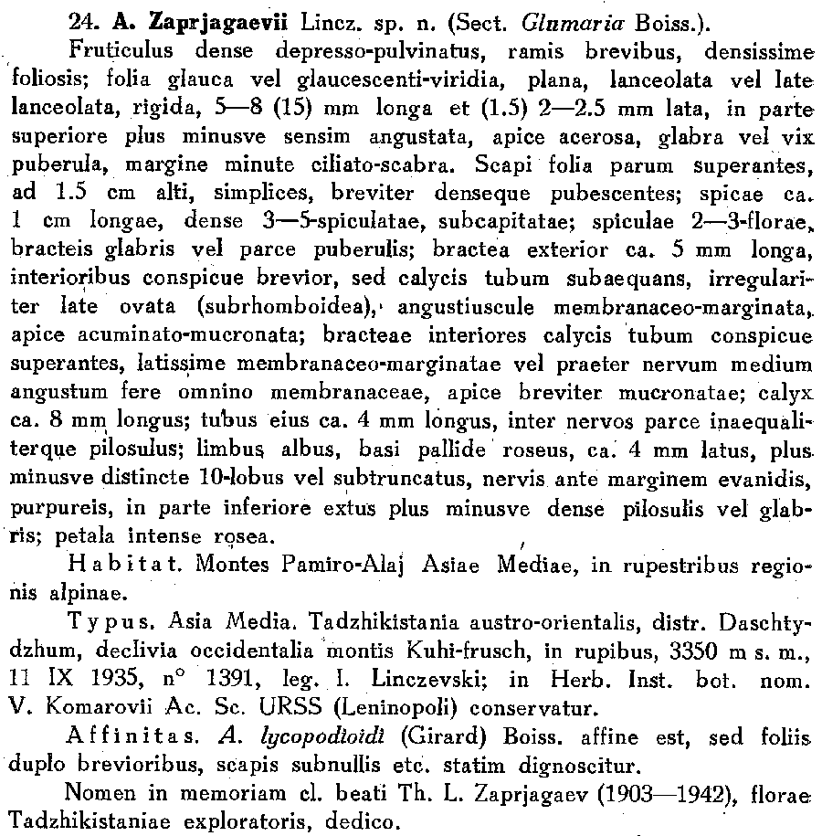 | Андрей Ковальчук | Протолог Acantholimon zaprjagaevii Lincz. (Флора СССР, т. 18: 732, 315-316. 1952):