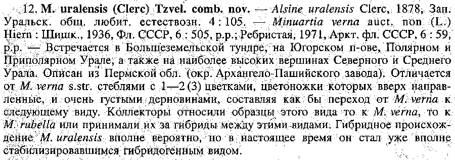 | Михаил Князев | Обрусевший швейцарский француз Онисим Егорович Клер метеоролог и ботаник-любитель описал Minuartia uralensis как вариацию.... точно не помню, что то наподобие Alsine verna var. uralensis Clerc. по гербарным сборам с известняковых скал по р. Вижай близ Пашийского завода (бассейн р. Чусовой)