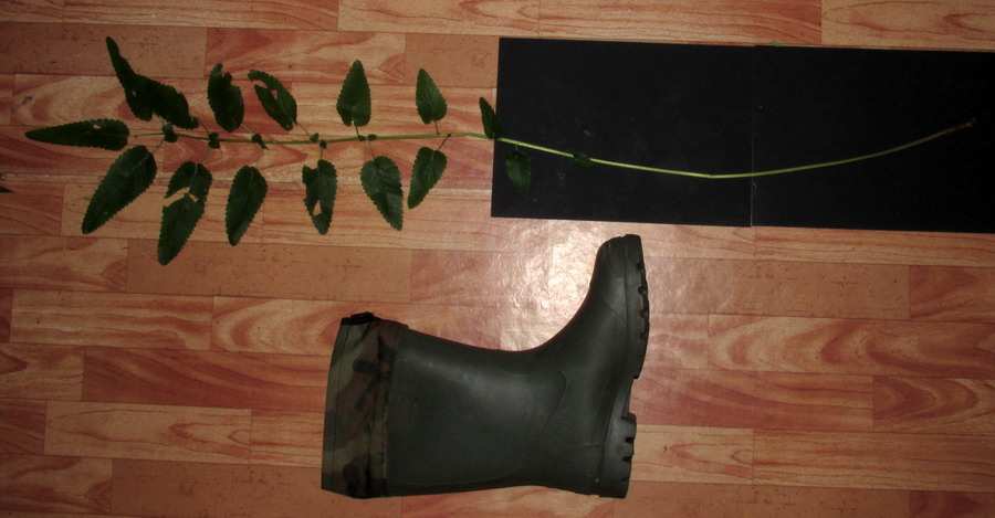 Вот фото прикорневого листа рядового растения по сравнению с сапогом 43 размера  (растение не выбирал, взял первое попавшееся. Обычно бывает и побольше по размерам). Другое фото - листочки с линейкой. Видно, что длина листочка более 10 см.