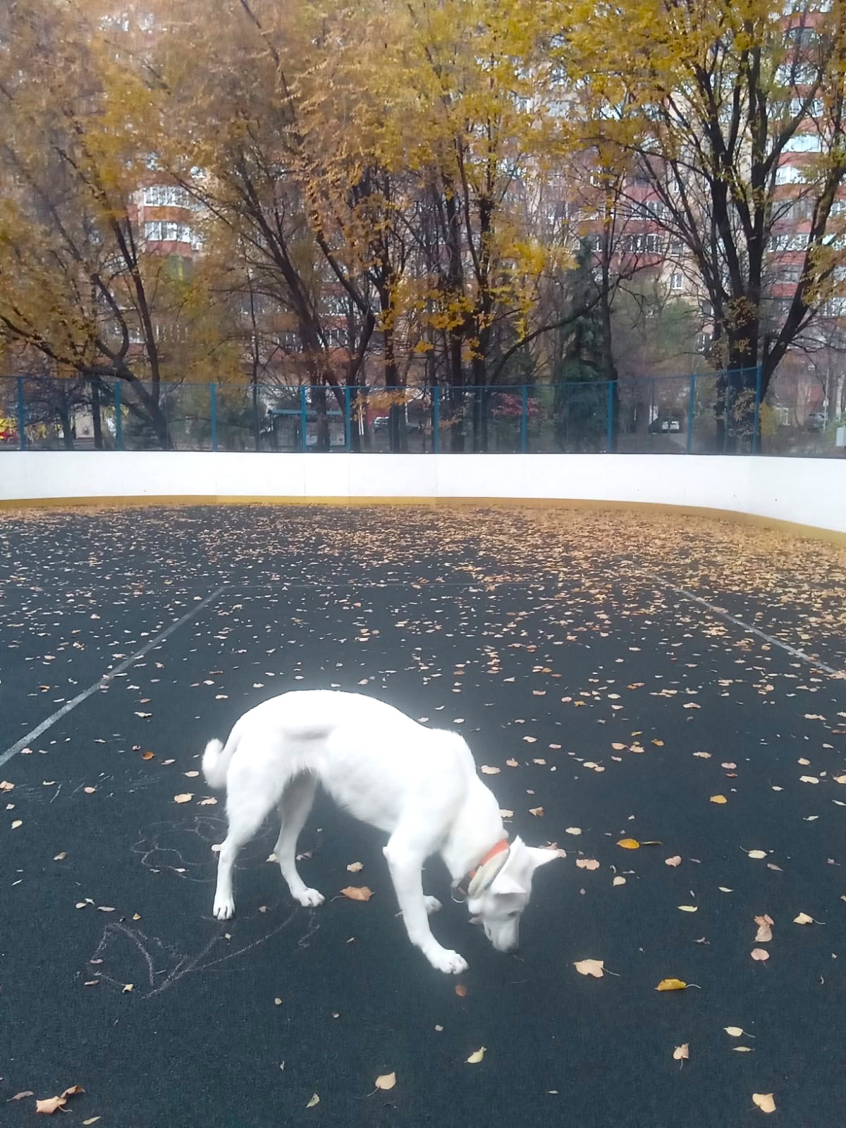 | Мария Козлова | Вот, приобщается к искусству на фоне осенних вязов. Дети разрисовали дворовый корт мелками — собака ходит, нюхает в недоумении) |