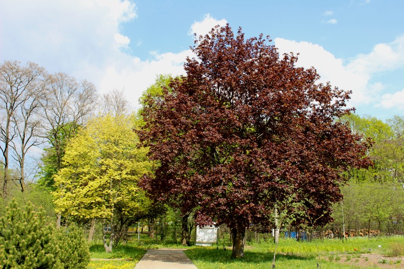 Я, когда водила экскурсии по ботсаду, рассказывпла про Клен остролистный 'Малиновый король'. Этот сорт имеет весной и летом пурпурно-фиолетовую окраску листьев, а к концу лета зеленым или, скорее, зелено-бурым становится. Просто в листьях изначально столько каротиноидов, что зеленого хлорофилла не видно, а летом, под влиянием высоких температур, эти пигменты постепенно разрушаются и листья зеленеют |