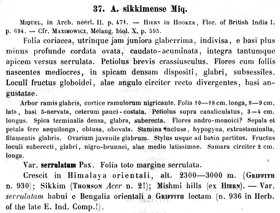 Протолог Acer sikkimense var. serrulatum Pax (Botanische Jahrbücher fur Systematik, Pflanzengeschichte und Pflanzengeographie 7: 215. 1886):