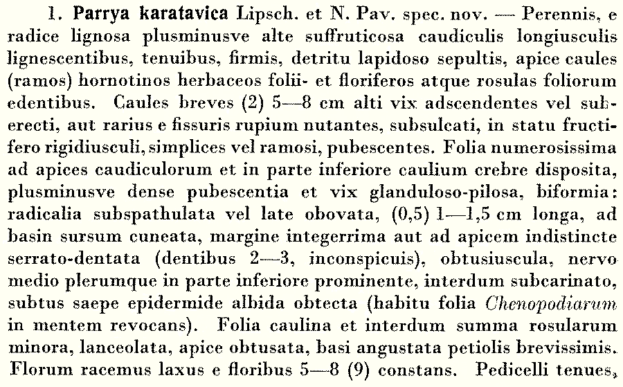Протолог Parrya karatavica Lipsch. et Pavlov (Repertorium specierum novarum regni vegetabilis 39: 318(-319). 1936):