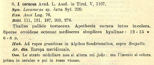 Обнародование комбинации Ionaspis ceracea (Arnold) Jatta ["Jonaspis"] в Flora Italica cryptogama. Pars III: Lichenes. p. 451 (1910):