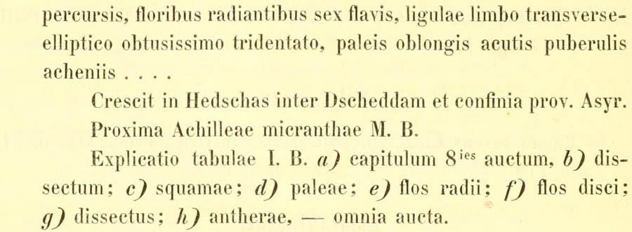 Протолог Achillea arabica Kotschy и сопровождающая его иллюстрация (Sitzungsberichte der Kaiserlichen Akademie der Wissenschaften. Mathematisch-Naturwissenschaftliche Classe Bd. 52, Abt. 1: 255(-256). 1866):