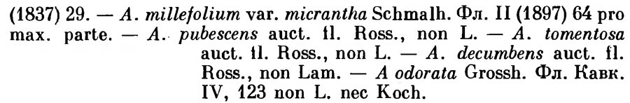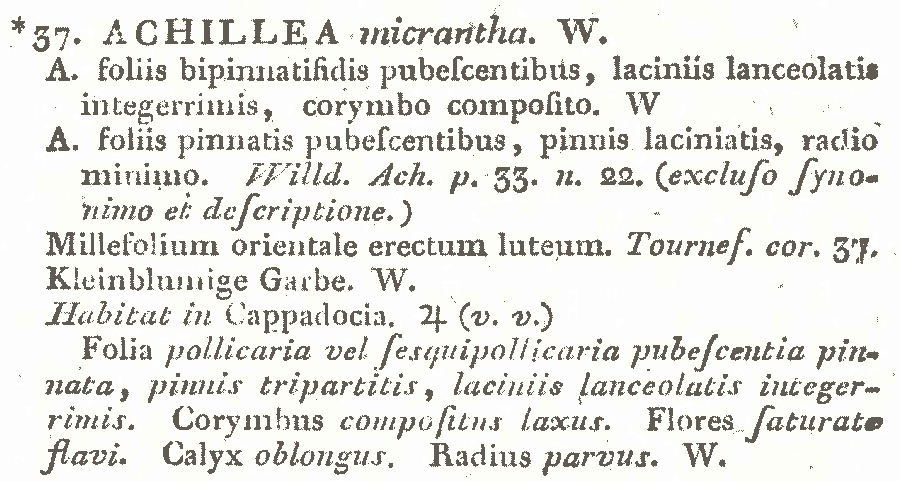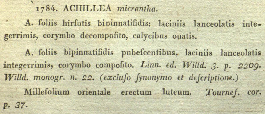 | Андрей Ковальчук | Отписание Achillea micrantha из работы М. Биберштейна "Flora Taurico-Caucasica exhibens stirpes phaenogamas, in Chersoneso Taurica et regionibus caucasicis sponte crescentes" 2: 336. 1808 (авторство этой комбинации нередко неправильно приписывалось Биберштейну):