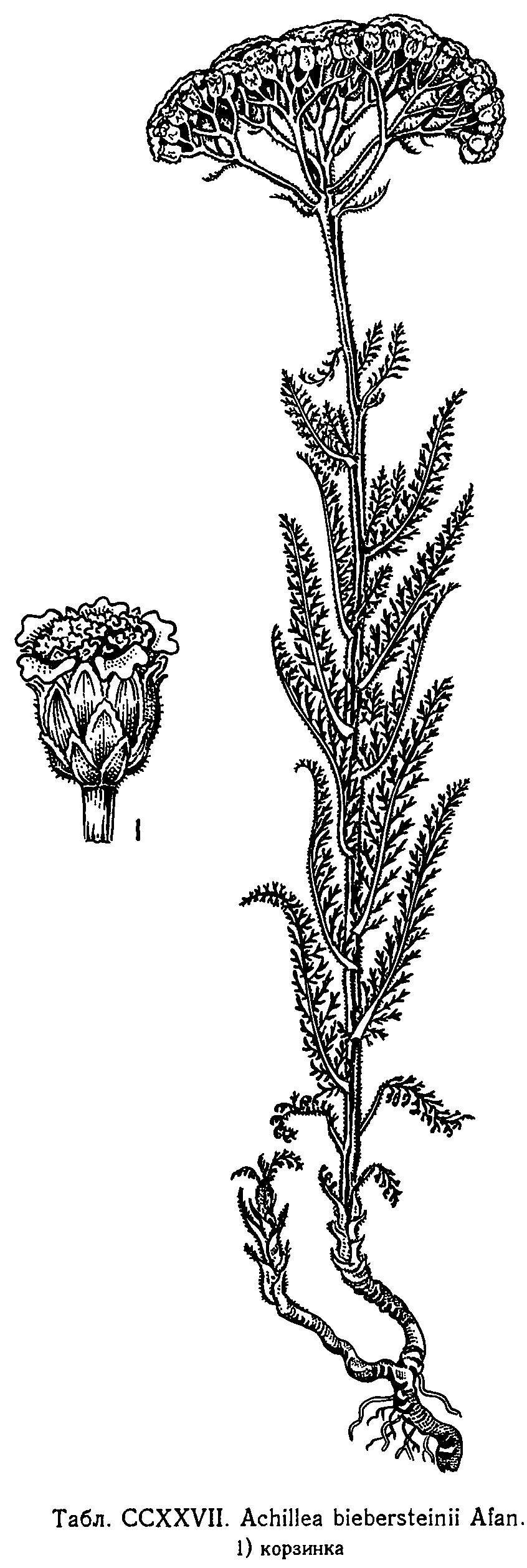 | Андрей Ковальчук | Обнародование комбинации Achillea biebersteinii Afan. (Ботанические материалы гербария Ботанического института АН СССР 19: 361(-362). 1959) (лектотип: Azerbaijan. ”Talüsch” [Talış Mts.], [Juny 1830,] C.A. Meyer [part of Meyer’s Enumeratio plantarum Caucasicum 633, distributed as A. pubescens in 1832] (G-DC, lectotype; isolectotype LE); выбран А. Н. Сенниковым в Memoranda Soc. Fauna Flora Fennica 87: 42. 2011):