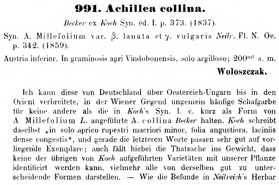 Обнародование комбинации Achillea collina (Wirtg.) Heimerl (Kerner, Sched. Fl. Exs. Austro-Hung. 3: 116. 1883):