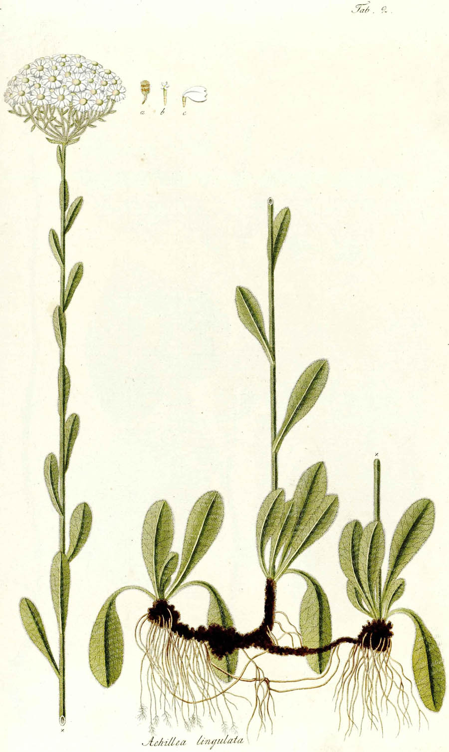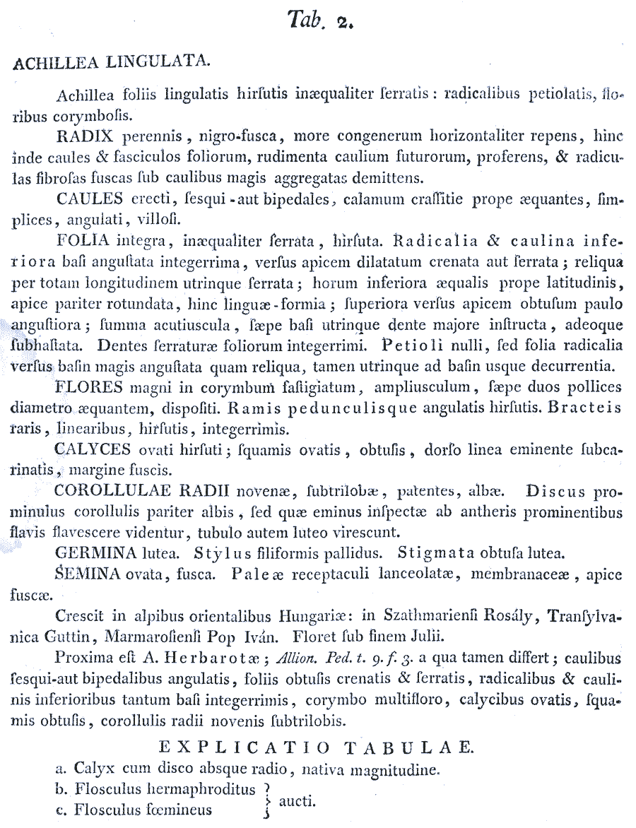 Протолог Achillea lingulata Waldst. & Kit. и сопровождающая его иллюстрация (Descriptiones et Icones Plantarum Rariorum Hungariae 1: 2, t. 2. [1799-1802]):