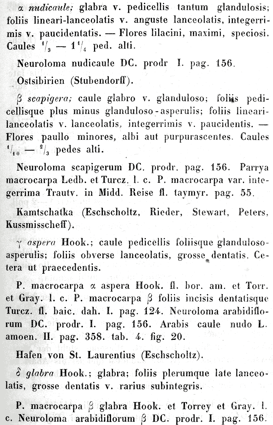 | Андрей Ковальчук | Вызывает некоторое сомнение принятое в The Plant List отнесение к синонимам Parrya nudicaulis комбинаций Neuroloma speciosum Steud. и Parrya integerrima G. Don. Как видно из протологов, оба названия относятся к растению, описаному как Hesperis speciosa Sweet, но растение, изображённое на рисунке, не очень=то похоже на Parrya nudicaulis. |