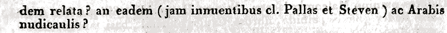 Как оказалось, ответ на этот вопрос уже есть в литературе. Д. А. Герман (Phytotaxa 173(1): 31-40) убедительно показал, что, вопреки укоренившемуся в литературе представлению, растение, изображённое на данном рисунке, представляет собой не что иное, как Dendroarabis fruticulosa (C.A. Mey.) German & Al-Shehbaz ≡ Arabis fruticulosa Meyer. Соответственно, названия Parrya integerrima G. Don, Hesperis speciosa Sweet и Neuroloma speciosum (Sweet) Steud. следует считать синонимами Dendroarabis fruticulosa (C.A. Mey.) German & Al-Shehbaz, а не Parrya nudicaulis. Предлагаю и нам последовать данному мнению и внести соответствующие изменения. |