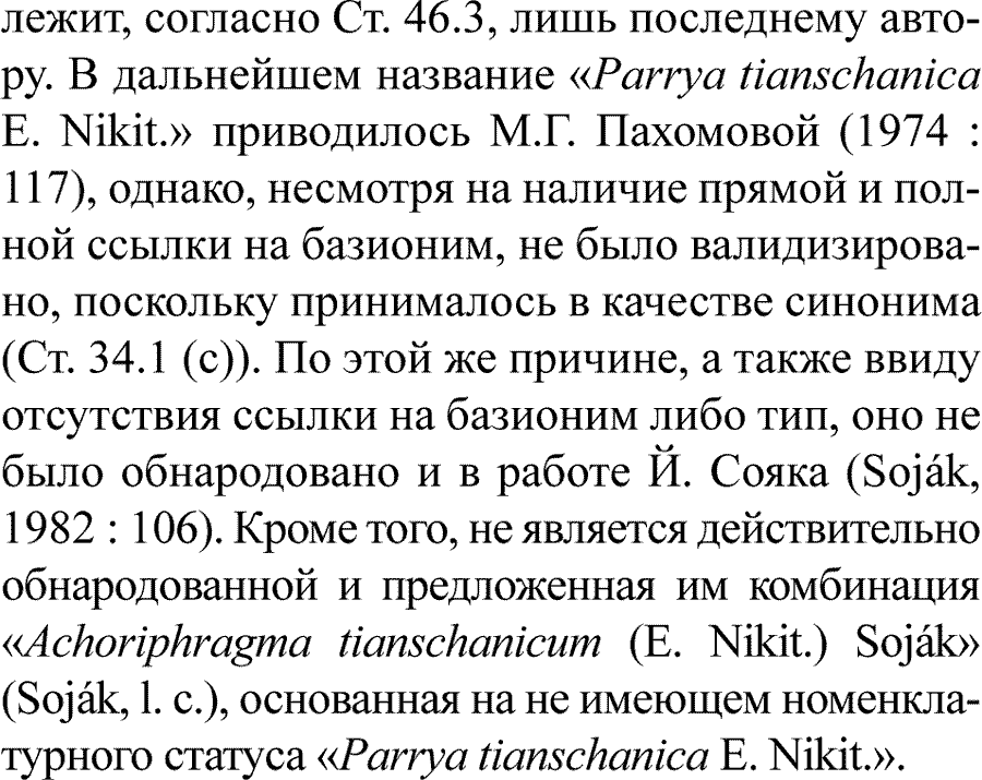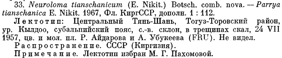 NOTES. By citing two collections as ‘type’, Nikitina (1967) invalidly published the name Parrya tianschanica under Art. 40.1 (McNeill et al. 2012). A combination with the same epithet was validated later by Botschantzev (1972: 673) by citing the single collection as ‘lectotype’ (i.e., holotype; Art. 40.3) in the genus Neuroloma, which was used as the basionym for validating the name P. tianschanica (German 2012b). |