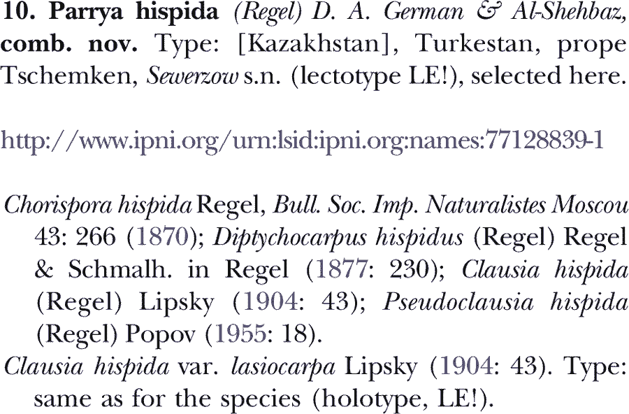 | Андрей Ковальчук | Обнародование комбинации Parrya hispida (Regel) D.A. German & Al-Shehbaz (Kew Bulletin 68(3): 463. 2013 [22 Jun 2013]):