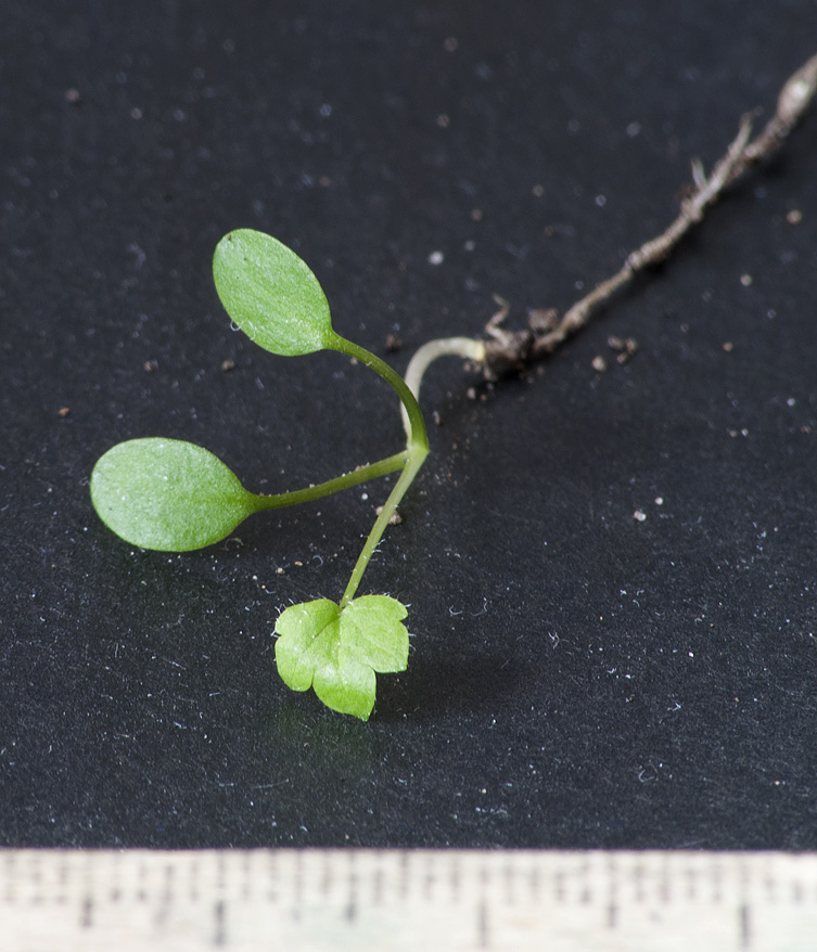 Там, откуда земля, растёт немного видов. В основном купырь и крапива. Правда, есть и адокса, и Stellaria nemorum, наверняка и ещё что-то. Вот это мне кажется лютиком. Недалеко растут ползучий, что-то едкоообразное. Но по определителю проростков Васильченко не определяется. Пришла на род лютик, а там всего 3 вида. И ничего не подходит (у едкого должно быть 3 зубчика на 1 настоящем листе, а здесь их 5, да ещё и волоски сверху). Нет идей ни у кого?
