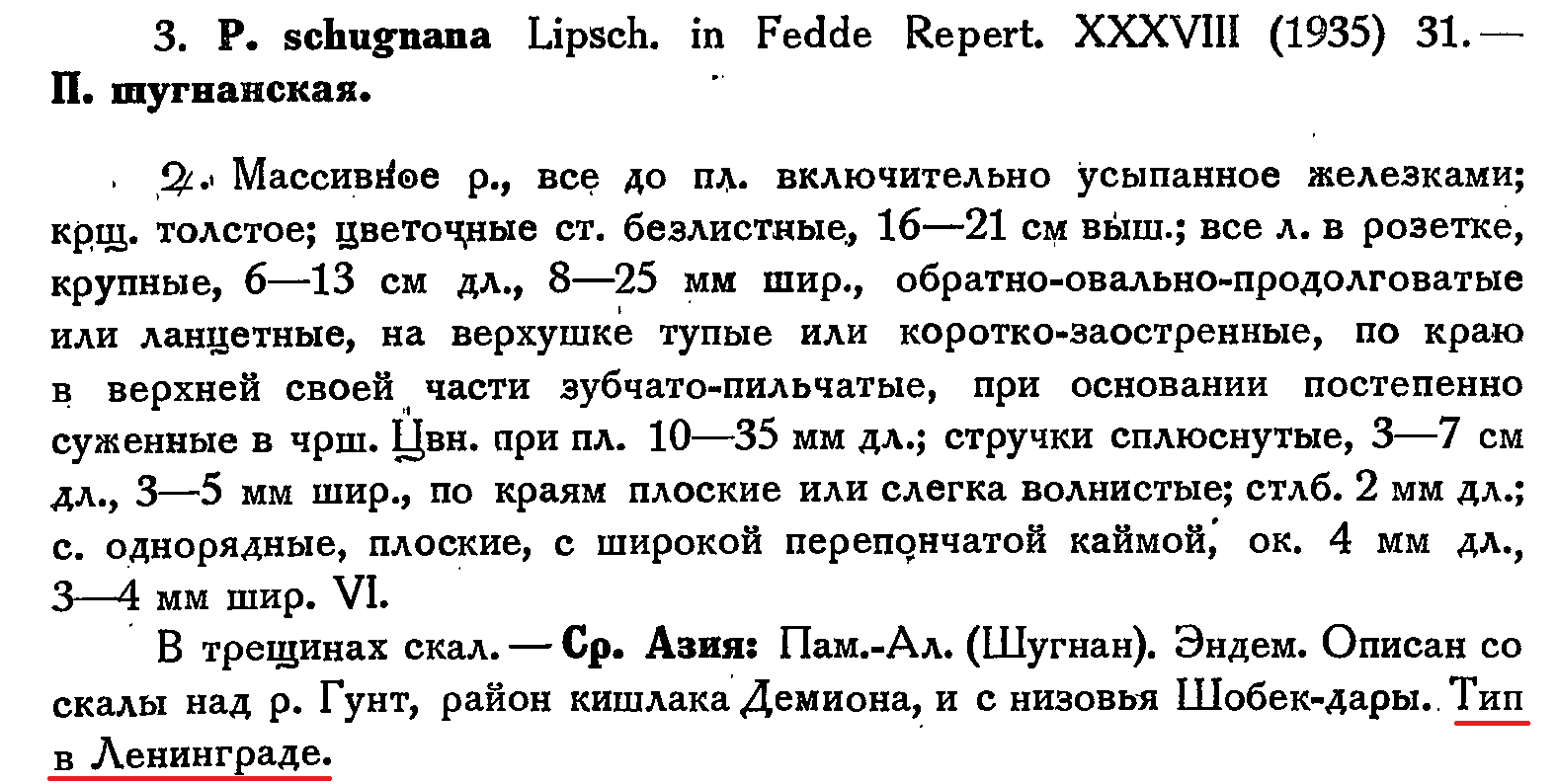 Type: [Tajikistan], Shugnan, cliff above river Gunt, vicinity of village Demiona, 22 July 1931, Yu. Lipschitz 611 (holotype MW!; isotypes LE!, MW × 3 sheets!).
