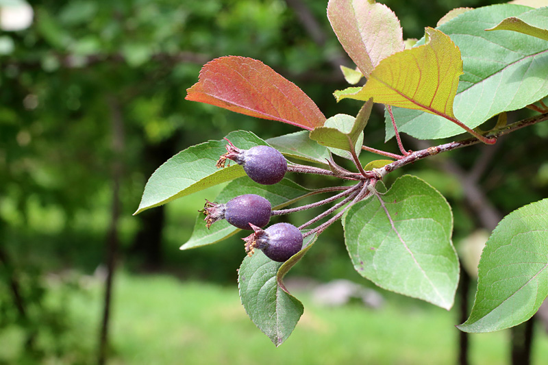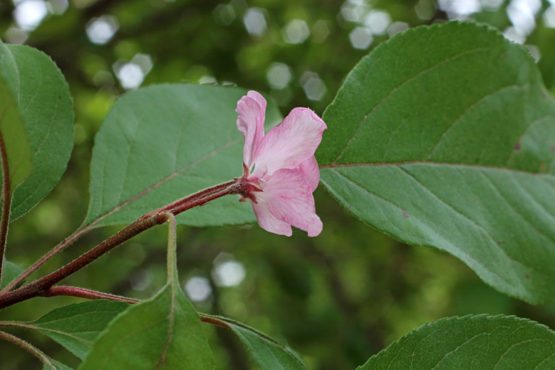 Осенью прошлого года в саду в парке попалось небольшое деревце незнакомой плодоносящей яблони. В этом году опоздал к цветению (фото единственного найденного цветка прилагается), но несколько снимков сделал.