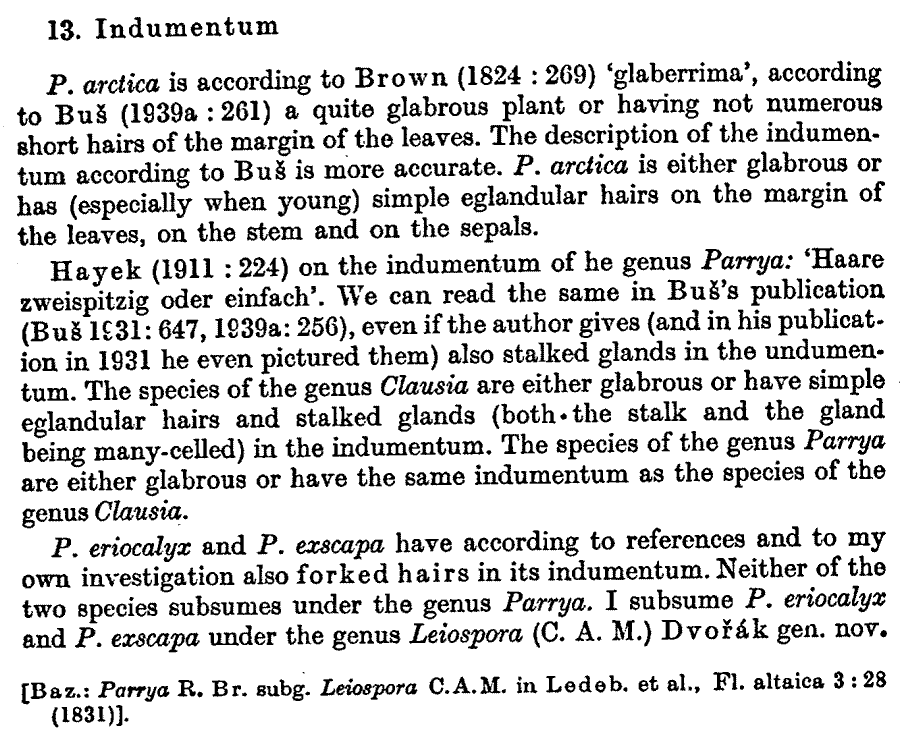 | Андрей Ковальчук | Обнародование комбинации (родового названия) Leiospora (C.A.Mey.) F.Dvořák (Spisy Prirodovedecké faculty University J. E. Purkyné v Brne 497: 356. 1968; тип: Leiospora exscapa (C.A. Mey.) F.Dvořák = Parrya exscapa C.A. Mey.):