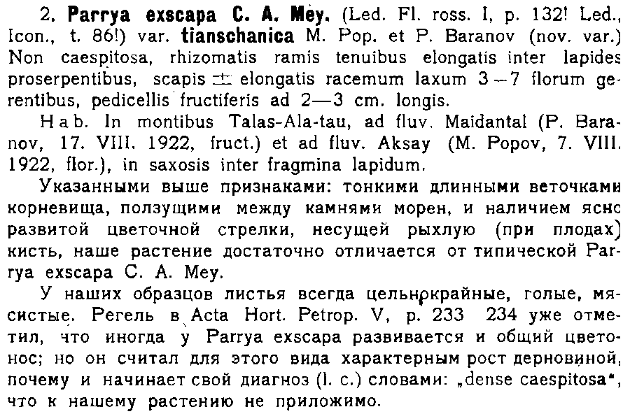 | Андрей Ковальчук | Протолог Parrya exscapa var. tianschanica M. Pop. et P. Baranov (Ботанические материалы Гербария Главного ботанического сада РСФСР 4 (21-22): 176. 1923):