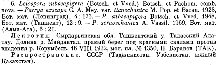 | Андрей Ковальчук | Обнародование комбинации Leiospora subscapigera (Botsch. & Vved.) Botsch. & Pachom. (Ботанический журнал 57(6): 669. 1972):