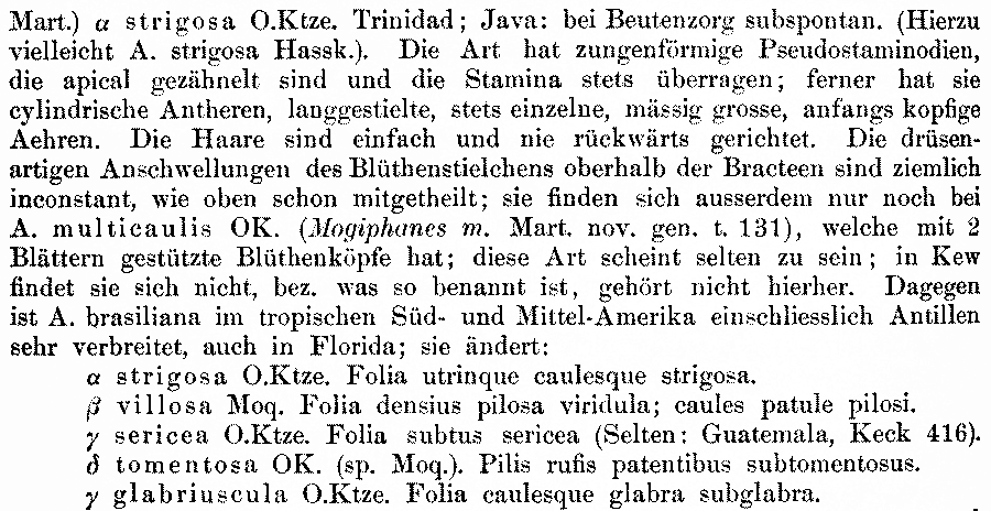 | Андрей Ковальчук | Обнародование комбинаций Alternanthera brasiliana (L.) Kuntze и Alternanthera brasiliana var. sericea Kuntze (Revisio Generum Plantarum: vascularium omnium atque cellularium multarum secundum leges nomeclaturae internationales cum enumeratione plantarum exoticarum in itinere mundi collectarum 2: 537(-538). 1891 [5 Nov 1891]):