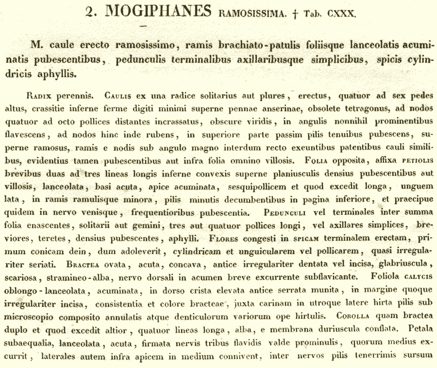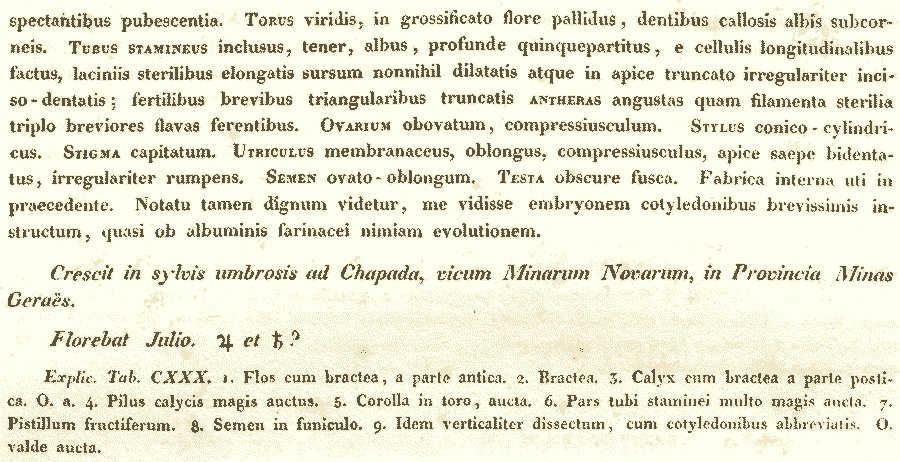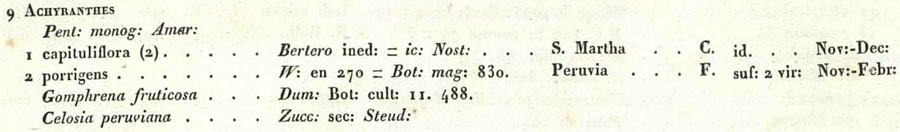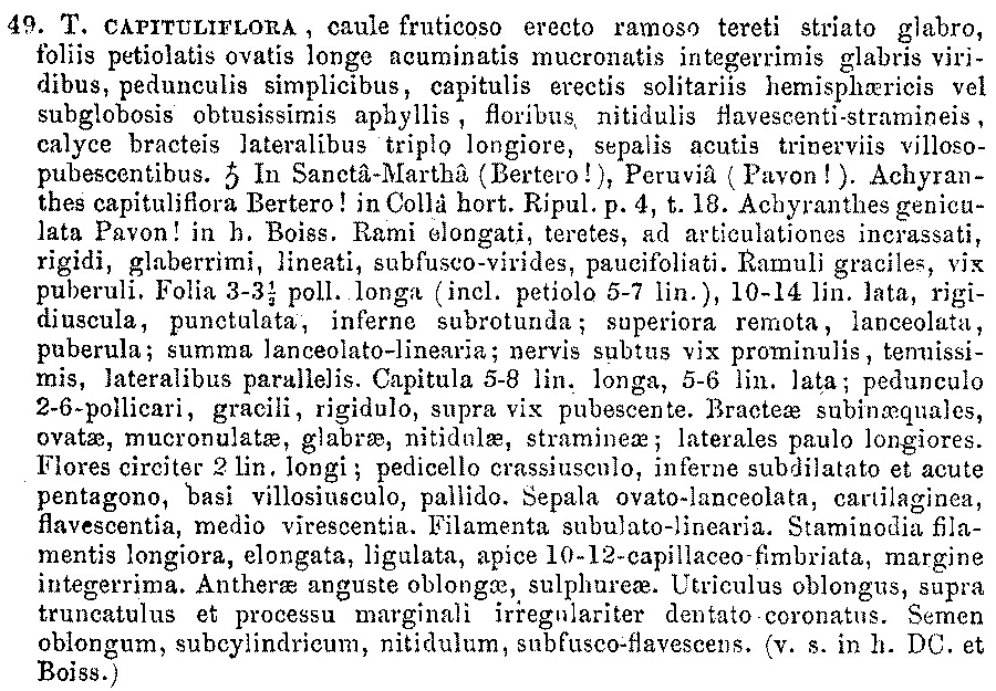 Протолог Achyranthes capituliflora Bertero и сопровождающая его иллюстрация (Hortus Ripulensis seu enumeratio plantarum quae ripulis coluntu / additis stirpium rariorum, vel nondum satis cognitarum, aut forte novarum notis, descriptionibus, et iconibus: 4, t. 18. 1824):