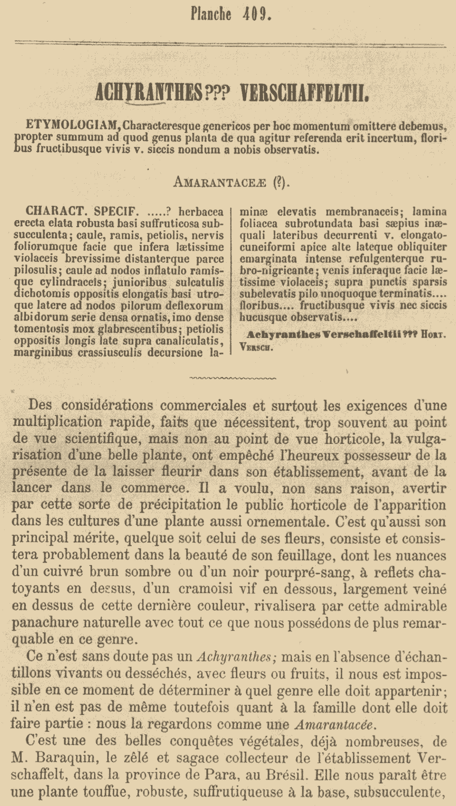 | Андрей Ковальчук | Протолог Achyranthes verschaffeltii Lem. и сопровождающая его иллюстрация (L'Illustration Horticole. 11: t. 409. 1864 [August 1864]):