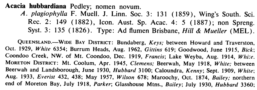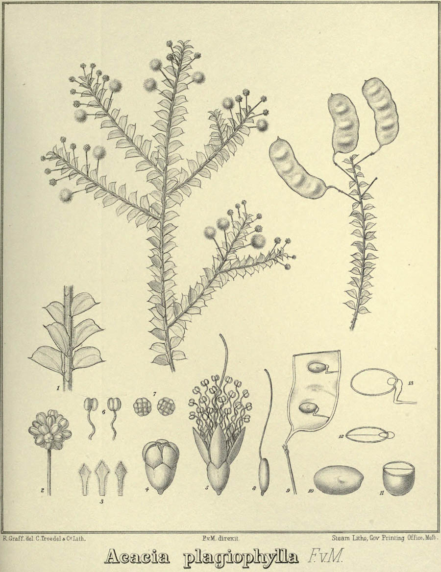 Протолог Acacia plagiophylla F. Muell., nom. illeg. (Journal of the Proceedings of the Linnean Society. Botany 3: 131. 1859):