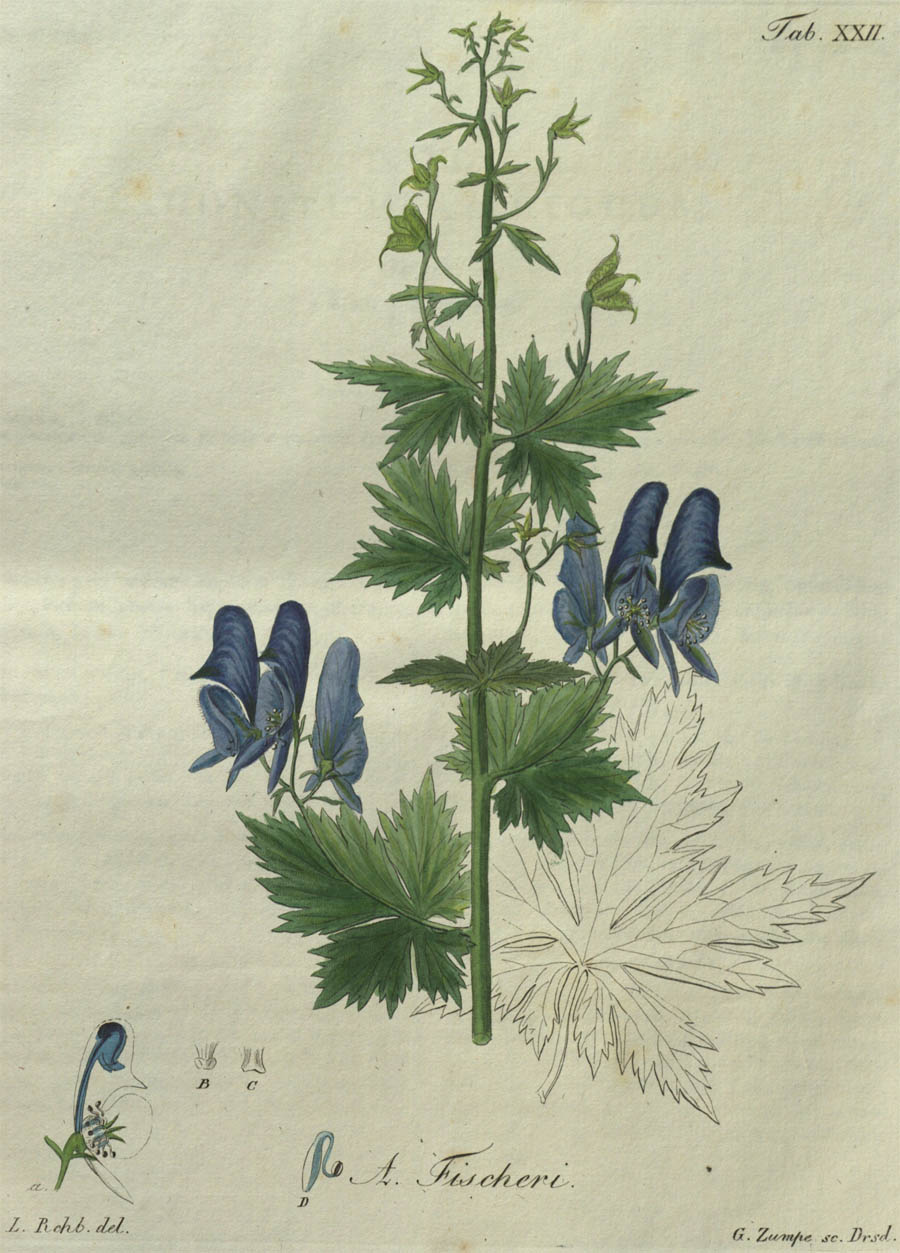 Протолог и иллюстрация (иконотип) Aconitum fischeri Rchb. (Illustratio Specierum Aconiti Generis: t. XXII. 1823):