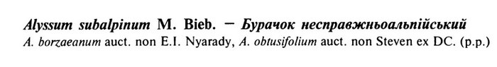 | Андрей Ковальчук | Что-то я сомневаюсь, что комбинацию Alyssum subalpinum Pall. ex Bieb. можно считать действительно обнародованной. Биберштейн приводит комбинацию A. subalpinum Pall. лишь как синоним A. serpillifolium:
