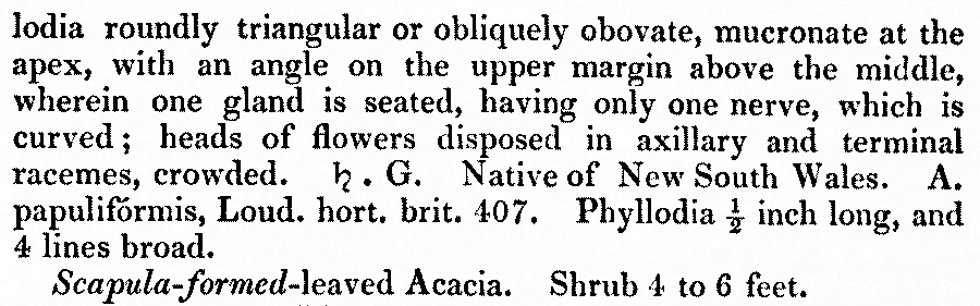 | Андрей Ковальчук | Фрагмент, в котором было опбуликовано название Acacia papuliformis Loudon, nom. nud. (Loudon's Hortus britannicus.A catalogue of all the plants indigenous, cultivated in, or introduced to Britain: 407. 1830):