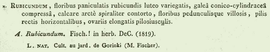 С другой стороны, это мог быть кто угодно, так достаточно было после публикации Seringe'а упомянуть в каком-нибудь делектусе 'Aconitum rubicundum Fisch.', и комбинация в ранге вида уже действительно обнародована. Вот только один из кандидатов (хотя, вполне вероятно, кто-то успел сделать это ещё раньше):