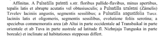 Relationship. This taxon differs from closely related species Pulsatilla patens s.str. by yellowish, less open flower, tepals broader and abruptly pointed or obtuse; from Pulsatilla uralensis (Zämelis) Tzvelev by narrower segments sessile leaves; from Pulsatilla angustifolia Turcz. by wider and not numerous, sessile leaf lobes, later development of leaves; from all these species by the range (from the Altai in the west to the Transbaikalia in the east and from Tuva in the south to the latitude of NizhnyayaTunguska river in the north) and attraction to steppe habitats.