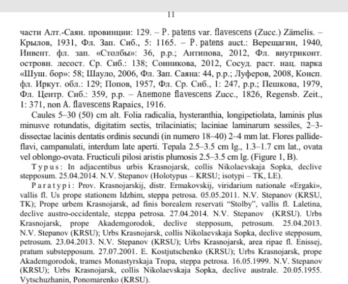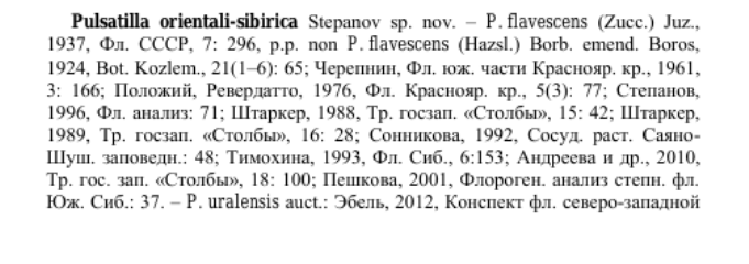 Pulsatilla orientali-sibirica Stepanov sp. nov. – P. flavescens (Zucc.) Juz., 1937, Фл. СССР, 7: 296, p.p. non P. flavescens (Hazsl.) Borb. emend. Boros, 1924, Bot. Kozlem., 21(1–6): 65; Черепнин, Фл. юж. части Краснояр. кр., 1961, 3: 166; Положий, Ревердатто, 1976, Фл. Краснояр. кр., 5(3): 77; Степанов, 1996, Фл. анализ: 71; Штаркер, 1988, Тр. госзап. «Столбы», 15: 42; Штаркер, 1989, Тр. госзап. «Столбы», 16: 28; Сонникова, 1992, Сосуд. раст. Саяно-Шуш. заповедн.: 48; Тимохина, 1993, Фл. Сиб., 6:153; Андреева и др., 2010, Тр. гос. зап. «Столбы», 18: 100; Пешкова, 2001, Флороген. анализ степн. фл. Юж. Сиб.: 37. – P. uralensis auct.: Эбель, 2012, Конспект фл. северо-западной части Алт.-Саян. провинции: 129. – P. patens var. flavescens (Zucc.) Zämelis. – Крылов, 1931, Фл. Зап. Сиб., 5: 1165. – P. patens auct.: Верещагин, 1940, Инвент. фл. зап. «Столбы»: 36, р.р.; Антипова, 2012, Фл. внутриконт. островн. лесост. Ср. Сиб.: 138; Сонникова, 2012, Сосуд. раст. нац. парка «Шуш. бор»: 58; Шауло, 2006, Фл. Зап. Саяна: 44, р.р.; Луферов, 2008, Консп. фл. Иркут. обл.: 129; Попов, 1957, Фл. Ср. Сиб., 1: 247, р.р.; Пешкова, 1979, Фл. Центр. Сиб.: 359, р.р. – Anemone flavescens Zucc., 1826, Regensb. Zeit., 1: 371, non A. flavescens Rapaics, 1916.