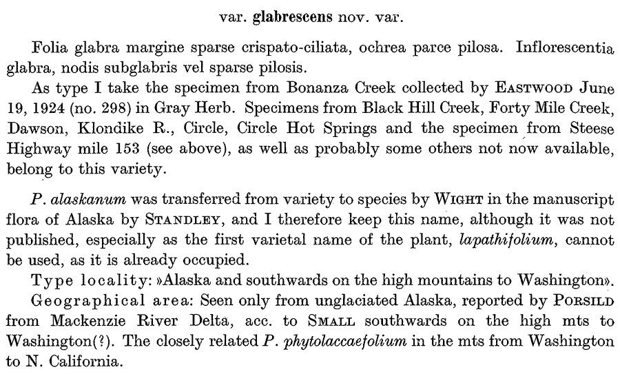 | Андрей Ковальчук | Наверное, не обязательно, просто в списке Черепанова была комбинация Polygonum alaskanum (Small) Wight ex Hult. И ещё можно было бы добавить комбинацию Polygonum alpinum var. lapathifolium Cham. & Schltdl., с которой всё и началось. |