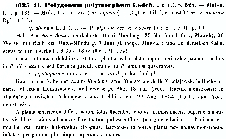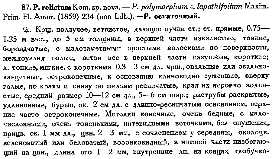 | Андрей Ковальчук | Описание Polygonum polymorphum var. lapathifolium (Mémoires présentés à l'Académie impériale des Sciences de St. Petersbourg par divers Savans et dans ses assemblées 9(Primitiae Florae Amurensis): 234. 1859) , цитируемое в протологе Polygonum relictum Kom.: