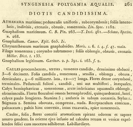 Протолог рода Diotis Desf., nom. illeg. (Flora Atlantica: sive historia plantarum quae in Atlante, agro tunetano et algeriensi crescunt 2: 260. 1799; non Diotis Schreb. (1791); тип: Diotis candidissima Desf., nom. illeg. (= Otanthus maritimus (L.) Hoffmanns. & Link ≡ Filago maritima L.Big smile image: