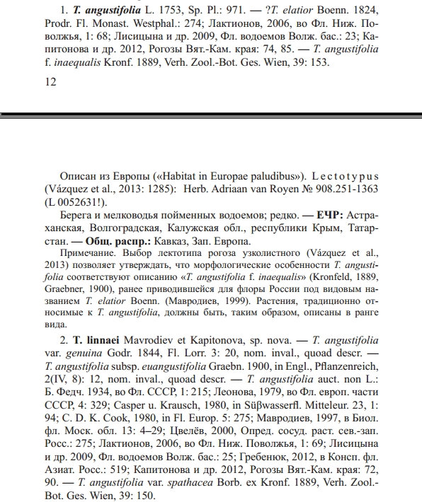 | Павел Евсеенков | Есть статья в которой говорится что растения, традиционно относимые к Typha angustifolia, следует относить к данному виду. А сама Typha angustifolia, если я правильно понял, есть синоним Typha elatior Boenn. Может прислушаемся ?