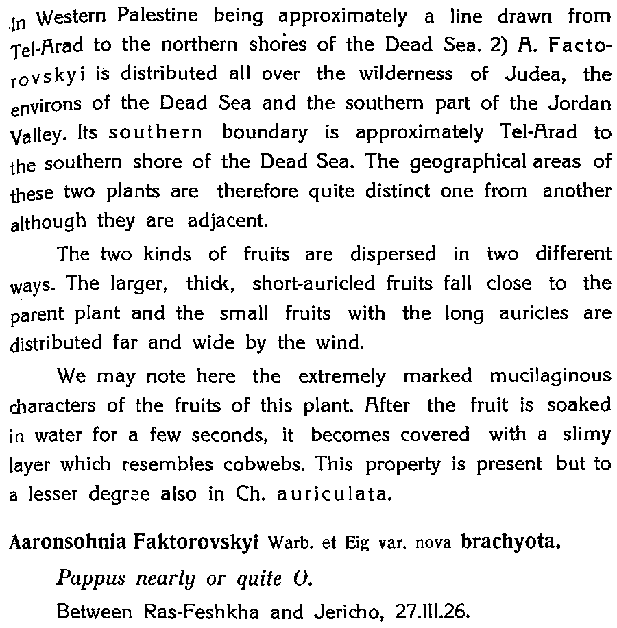Протолог Aaronsohnia factorovskyi Warb. & Eig (Bulletin // Agricultural Experiment Station, Institute of Agriculture and Natural History, The Zionist Organisation 6: 40(-43). 1927 (The Second Contribution to the Flora of Palestine  :