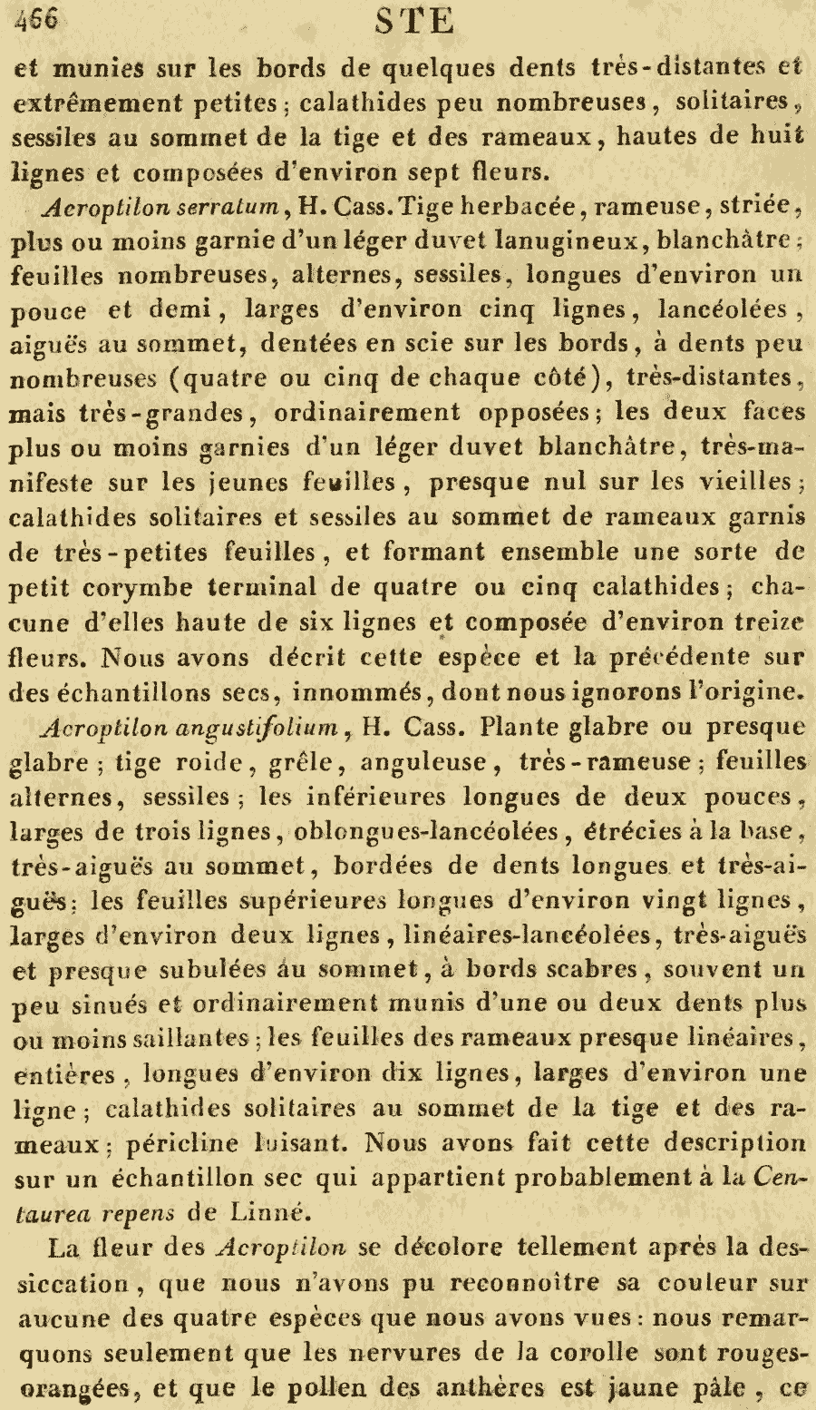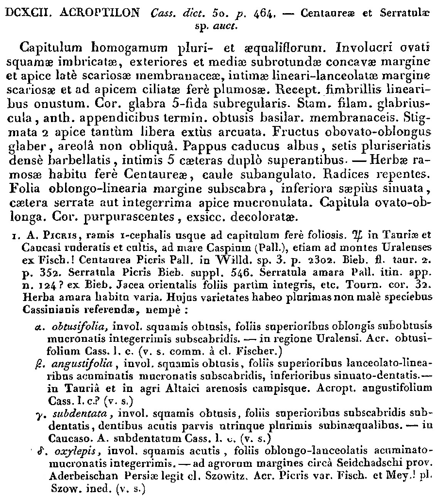 | Андрей Ковальчук | Протолог Acroptilon angustifolium Cass., Acroptilon obtusifolium Cass., Acroptilon serratum Cass. и Acroptilon subdentatum Cass. (Dictionnaire des Sciences Naturelles 50: 465-466. 1827 [Nov 1827]):
