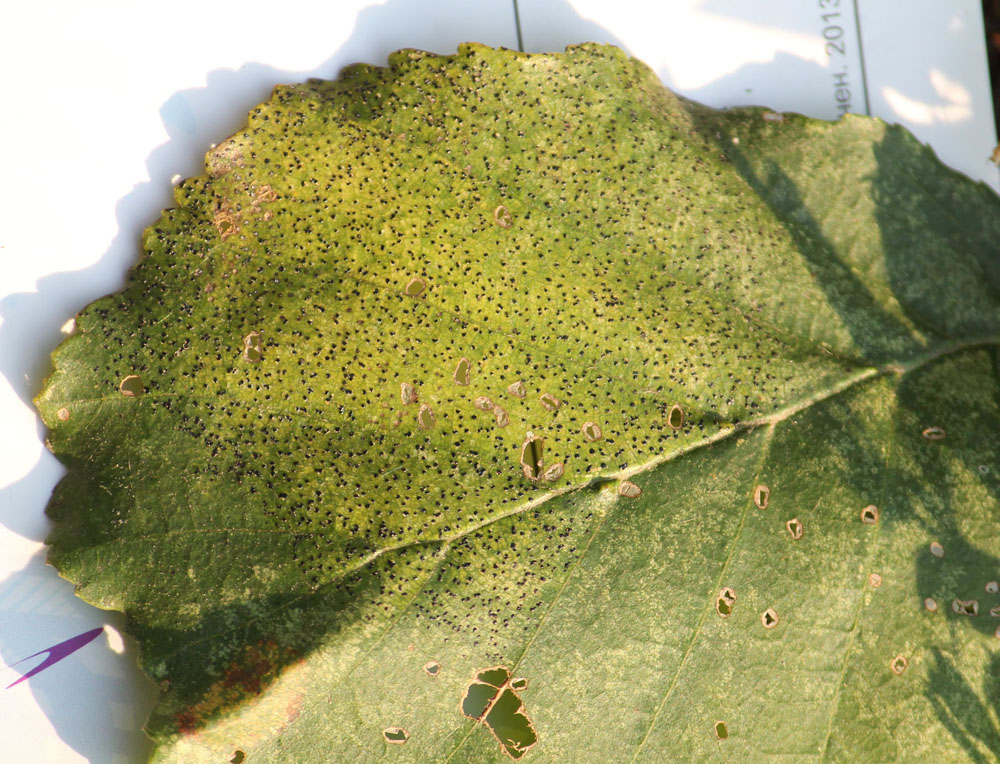 Может быть кто-нибудь подскажет что за паразитический гриб образует такие черные крапинки на верхней стороне листьев (не опавших) ольхи черной? Это чьё-то телиоспороношение? Сфотографировано в Минске, 20.09.2018.