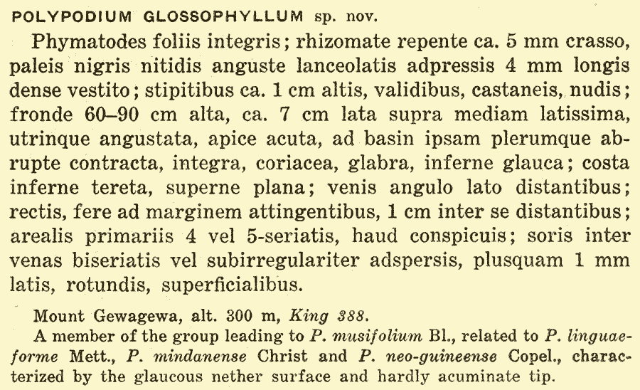 Протолог Polypodium glossophyllum Copel. (Philippine Journal of Science ser. C, 9(1): 7. 1914):