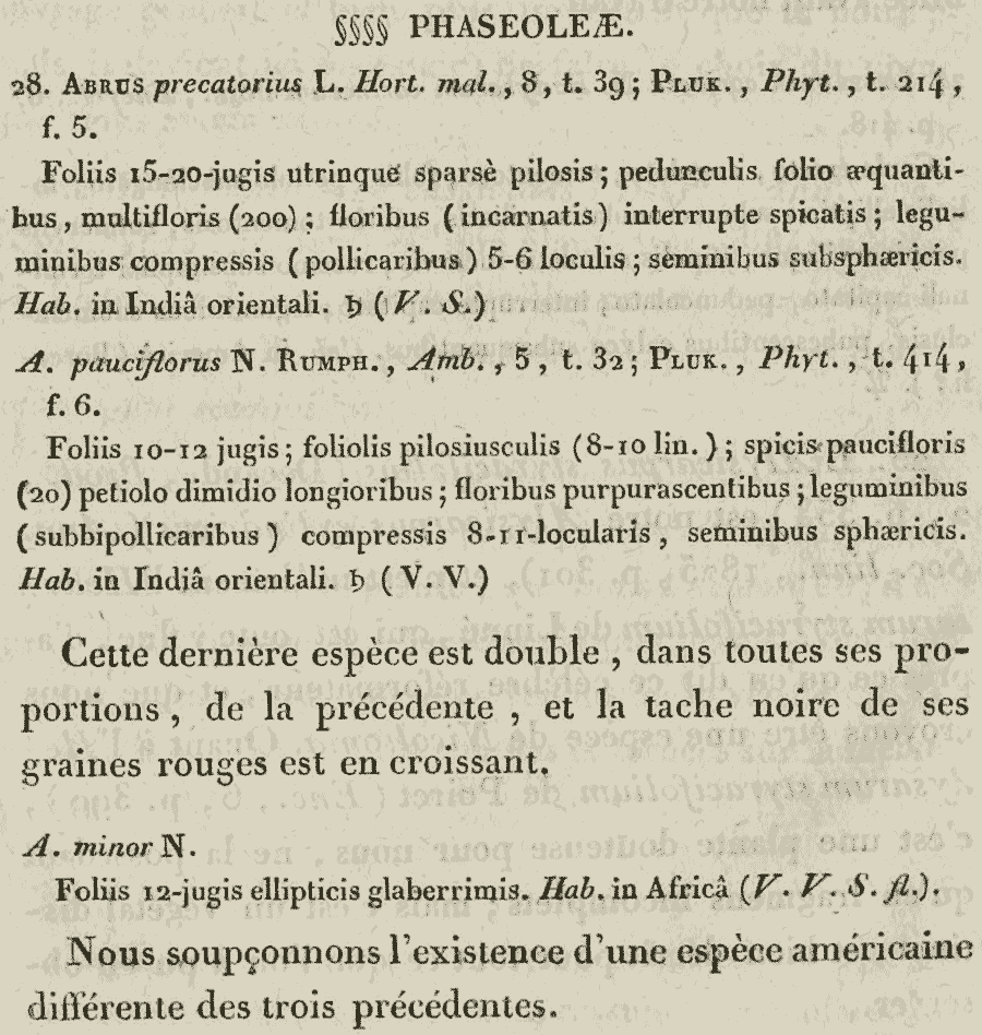 | Андрей Ковальчук | Список синонимов у нас базе соответствует таковому в Tropicos и основан на ревизии F. J. Bretelee (Blumea 10(2): 607-624. 1960). B. Verdcourt (Kew Bulletin 24(2): 235-307. 1970) выделил африканские растения в отдельный подвид A. precatorius subsp. africanus Verdc. Они отличаются от номинативного подвида более короткими плодами с мелкобугорчатой поверхностью (у растений номинативного подвида поверхность плодов гладкая). Названия A. minor, A. squamulosus и A. tunguensis B. Verdcourt отнёс к синонимам A. precatorius subsp. africanus.