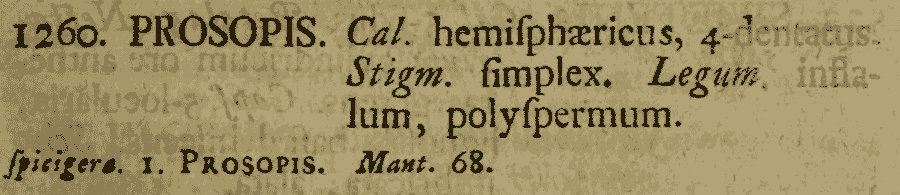 Протолог рода Prosopis L. (Systema Naturae, ed. 12. 2: 282 (293). 1767 [15-31 Oct 1767]; тип: Prosopis spicigera L. = Prosopis cineraria (L.) Druce (≡ Mimosa cineraria L.: