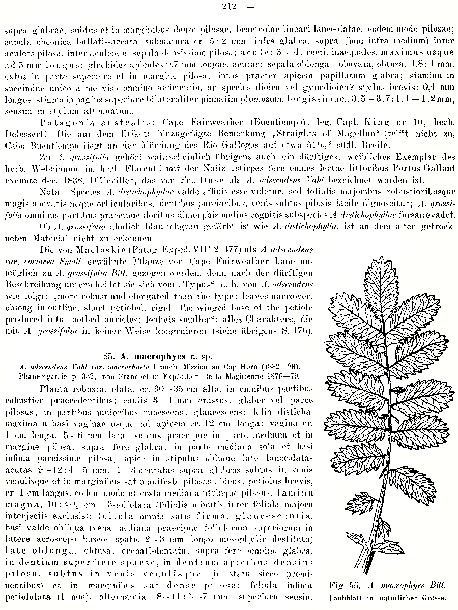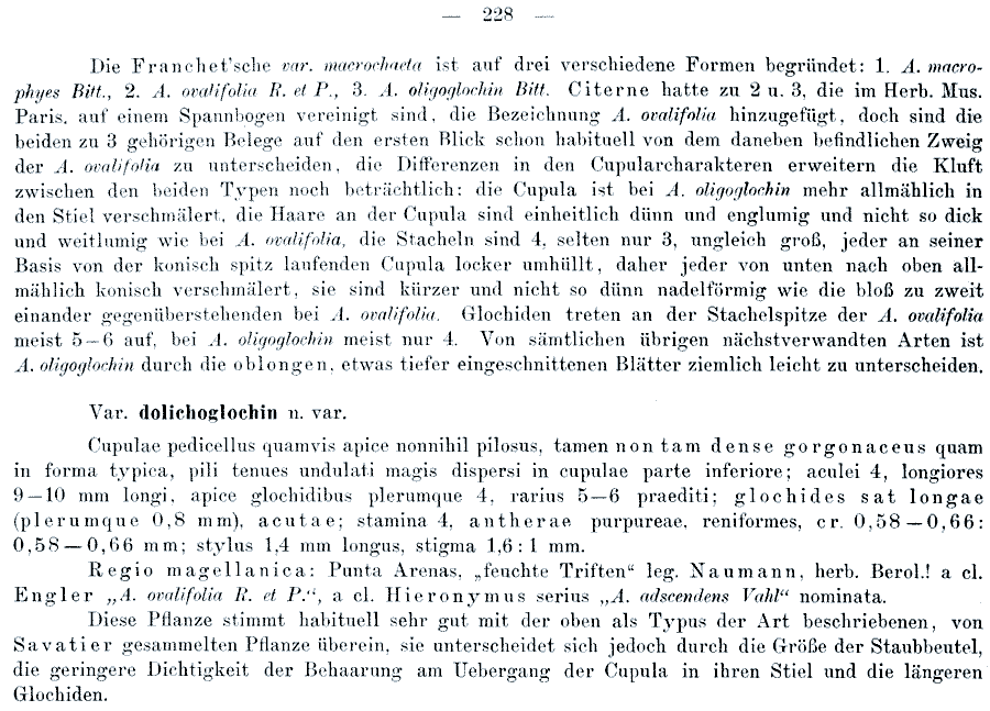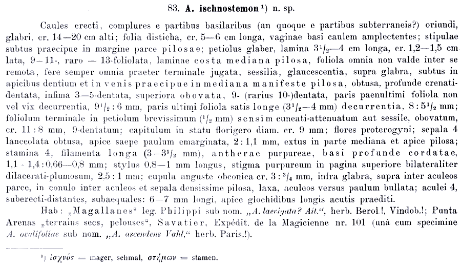 | Андрей Ковальчук | Протолог Acaena ischnostemon Bitter (Bibliotheca Botanica 17, Heft 74: 210, fig. 54. 1910), Acaena grossifolia Bitter (Bibliotheca Botanica 17, Heft 74: 211. 1910) и Acaena macrophyes Bitter (Bibliotheca Botanica 17, Heft 74: 212, fig. 55. 1910):