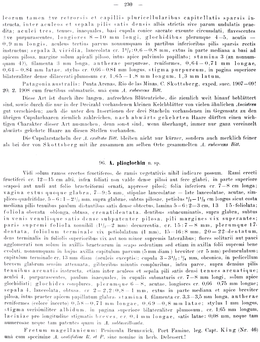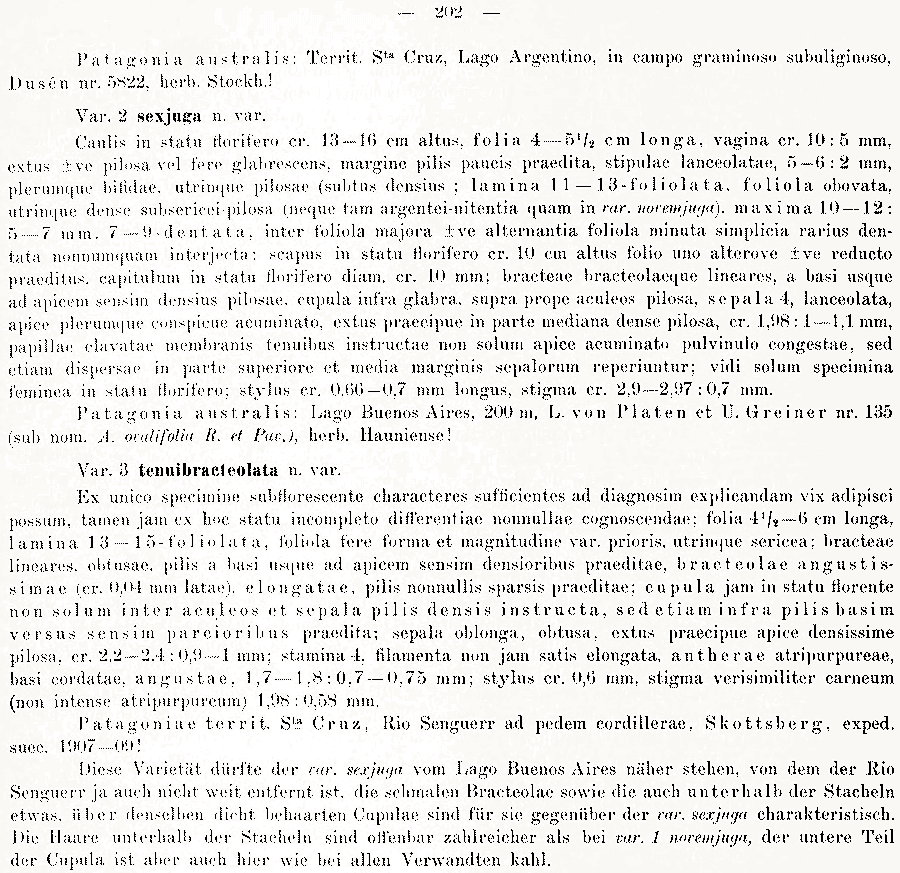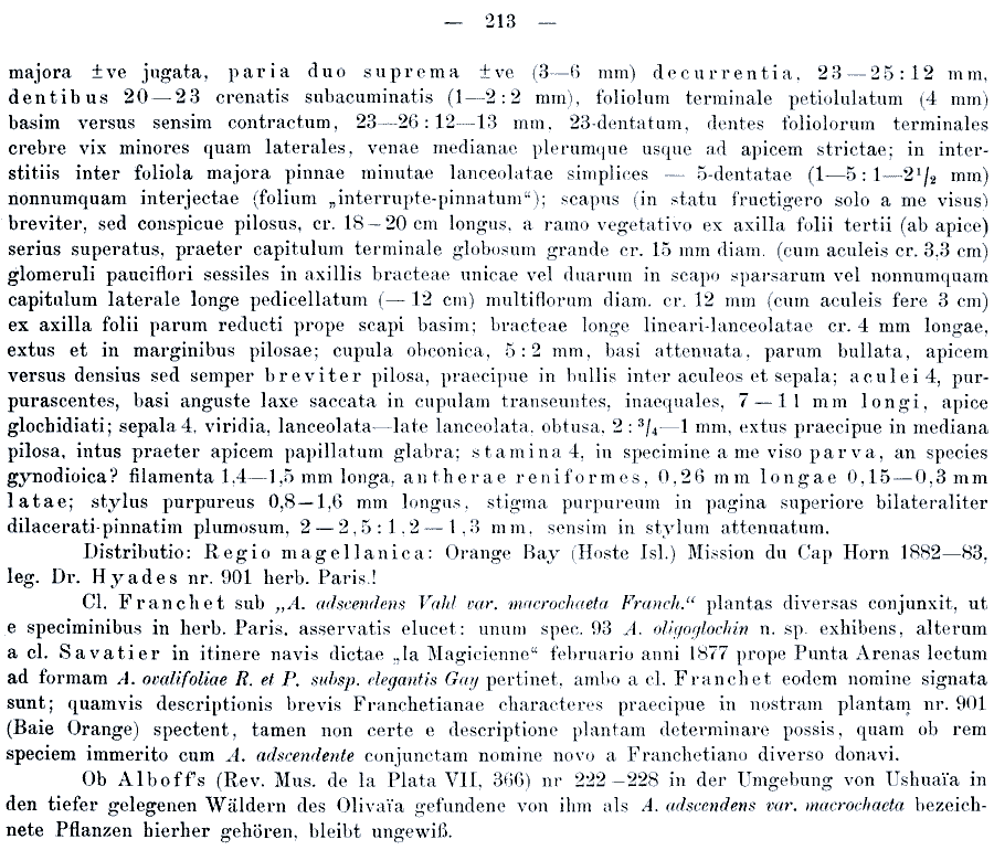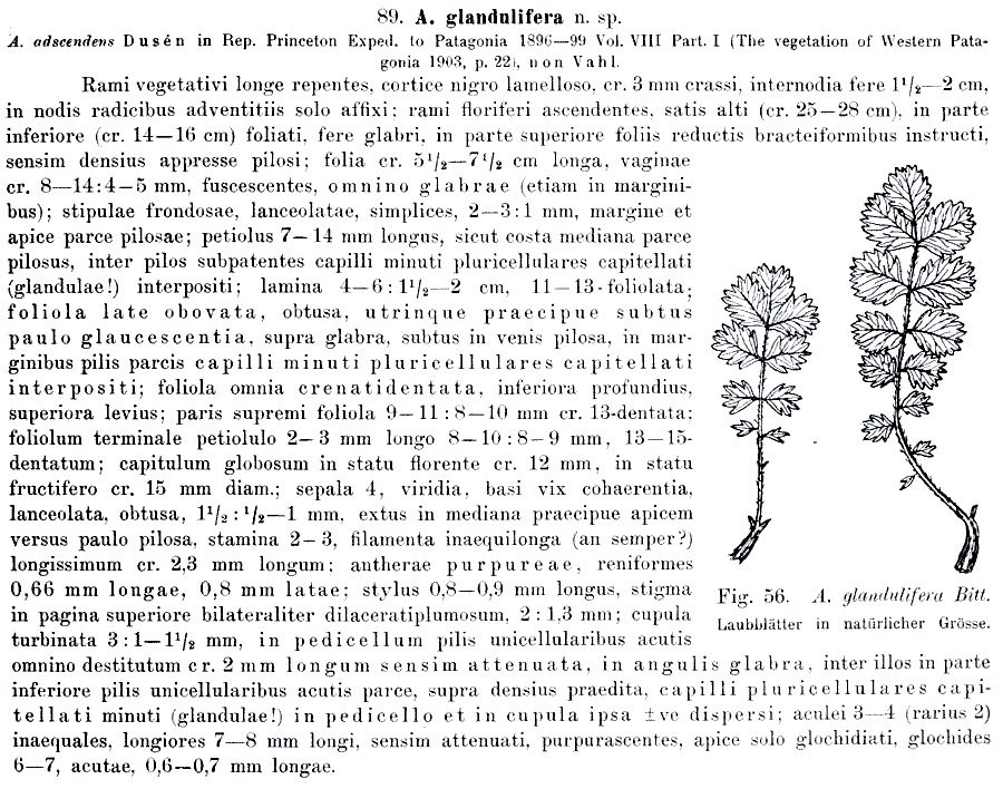 | Андрей Ковальчук | Протолог Acaena glandulifera Bitter (Bibliotheca Botanica 17, Heft 74: 223, fig. 56. 1910), Acaena subflaccida Bitter (Bibliotheca Botanica 17, Heft 74: 225, fig. 57. 1910) и Acaena rubescens Bitter (Bibliotheca Botanica 17, Heft 74: 225, Taf. XXII. 1910):