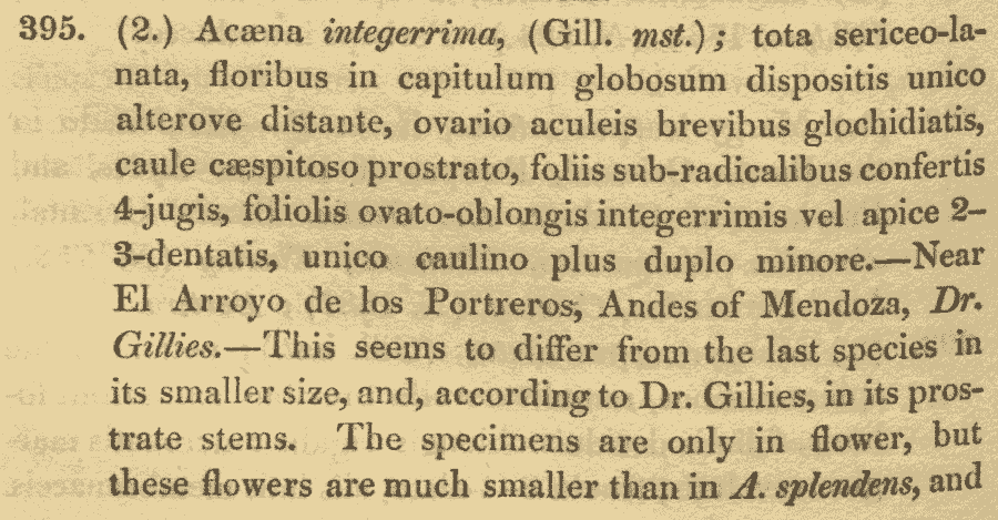 Протолог Acaena integerrima Gillies ex Hook. & Arn. (Botanical Miscellany 3: 306. 1833):