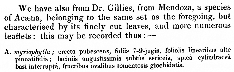 Протолог Acaena myriophylla Lindl. (Edwards's botanical register 15: t. 1271. 1829):